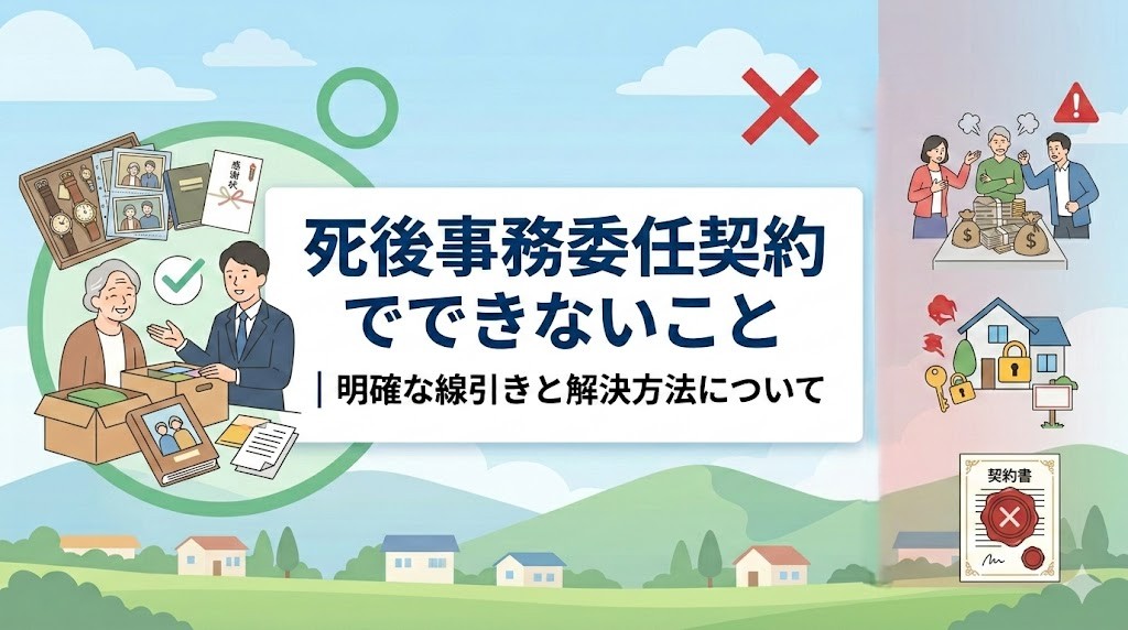 死後事務委任契約は主に「亡くなった直後の事務手続き」を代行するものですが、法的な権限には明確な限界があります。まずは、この契約だけでは対応できない代表的な項目を整理します。