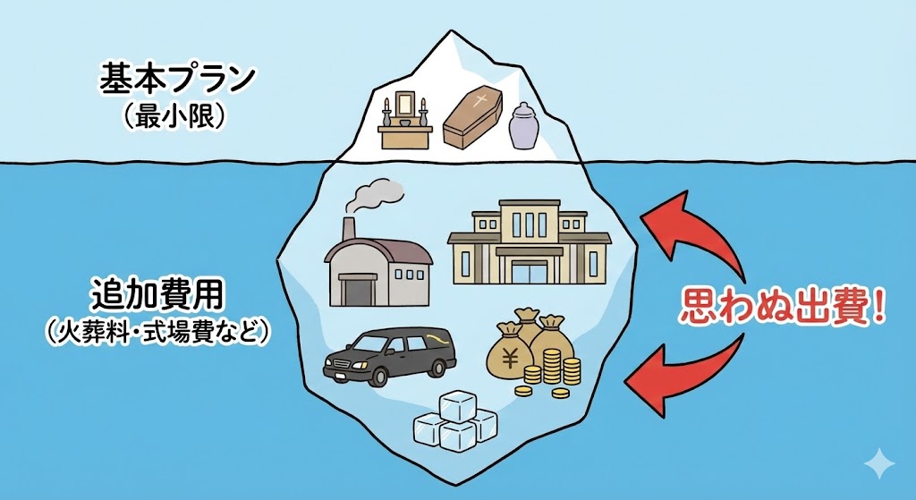 インターネットやチラシで「家族葬〇〇万円〜」という格安プランを目にしますが、これが「支払総額」になることはまずありません。多くの格安プランは、葬儀を行うための最低限の道具(祭壇や棺など)しか含まれていないからです。