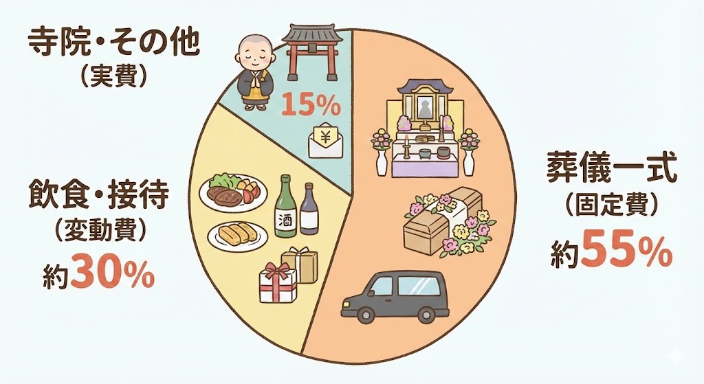 「一式費用」だけでなく、人数で変わる「飲食費」と、現金で用意する「お布施」まで含めた総額で予算を組むことが大切です。事前見積もりで全体像を把握しましょう。