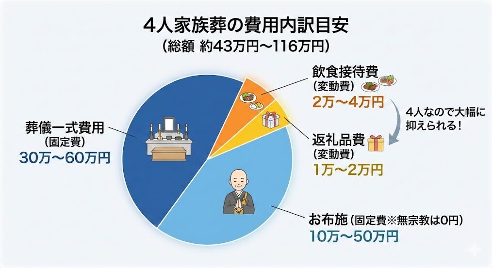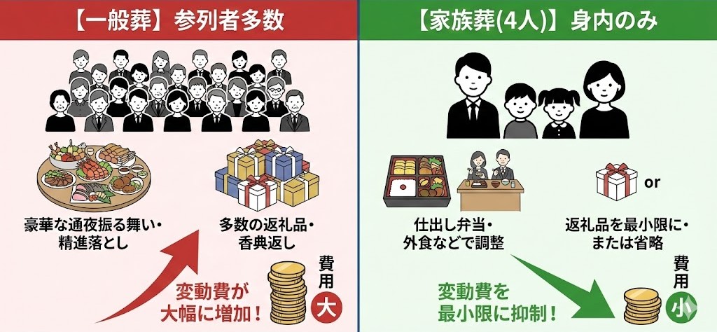 4人で行う家族葬は、飲食費や返礼品費などの変動費を抑えられるため、一般的な葬儀よりも費用負担を軽くすることが可能です。