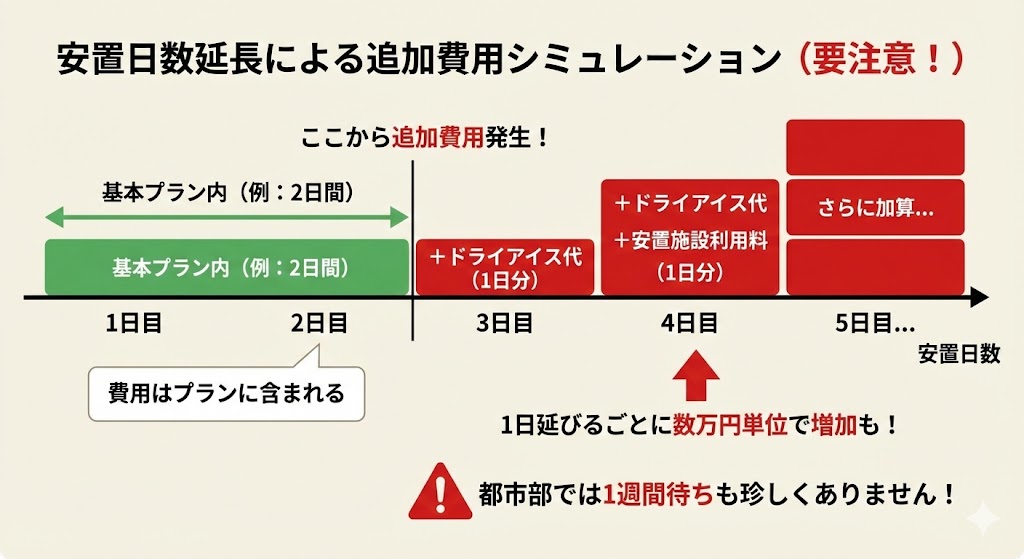 基本プランに含まれている安置日数は通常2〜3日程度ですが、火葬場の空き状況や友引などの日程の都合で安置期間が延びると、ドライアイス代や安置施設利用料が追加で発生します。特に都市部では火葬場が混雑しており、1週間近く待つケースも珍しくありません。1日延びるごとに数万円単位で費用が増えることもあるため、余裕を持った予算組みが必要です。