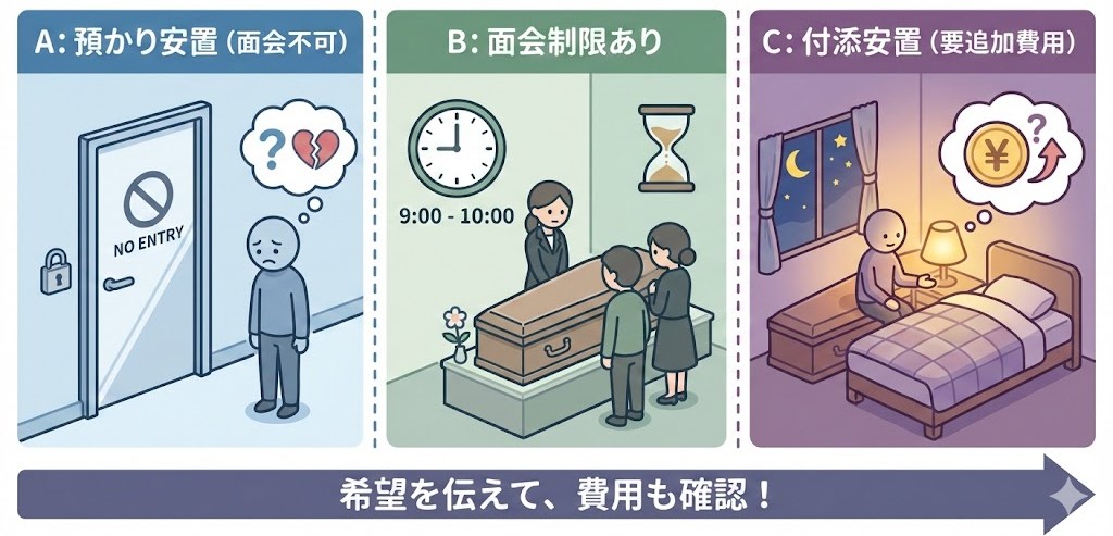 自宅に安置できない場合、葬儀社の安置施設を利用しますが、施設によっては「面会不可(預かり安置)」や「面会時間に制限あり」というケースが少なくありません。